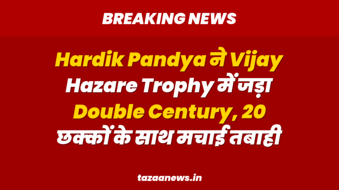 फिलहाल खेली जा रही विजय हजारे ट्रॉफी में हार्दिक पांड्या का बल्ला जमकर आग उगल रहा है। उन्होंने सिर्फ दो मैचों में कुल 208 रन ठोक दिए हैं, जिसमें उनका स्ट्राइक रेट 200 से भी ज्यादा रहा है। इन दो मैचों में उन्होंने 20 छक्के और 11 चौके लगाए हैं।