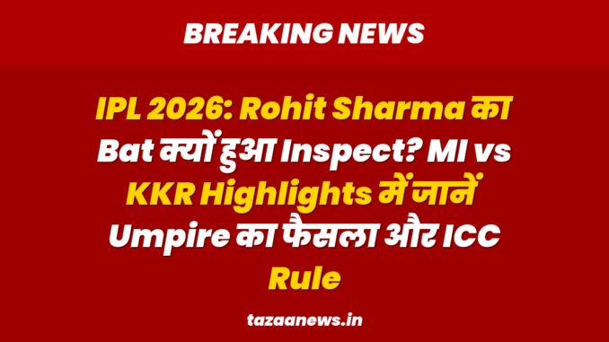 रोहित शर्मा ने कोलकाता नाइटराइडर्स (Kolkata Knight Riders) के खिलाफ एक धमाकेदार और तूफानी पारी खेली। एक पतले और फिट रोहित शर्मा (Fit Rohit Sharma) ने केकेआर के गेंदबाजों की खूब क्लास लगाई। लेकिन इसी दौरान एक ऐसी घटना हुई जिसने सबको हैरान कर दिया और रोहित शर्मा गुस्से (Rohit Sharma Angry) में नज़र आए। उनकी पारी शुरू होने से पहले उनके बल्ले (Rohit Sharma Bat) की अचानक जांच की गई। आइए जानते हैं क्या था पूरा मामला और क्यों रोहित शर्मा भड़क उठे।