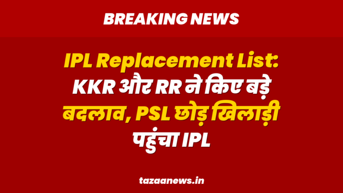 IPL 2026 की रिप्लेसमेंट लिस्ट आ गई है, जहाँ कुछ बड़े बदलाव देखने को मिले हैं। कई खिलाड़ियों ने IPL के लिए पाकिस्तान सुपर लीग (PSL) को अलविदा कहा है। IPL 2026 अब शुरू होने को है, और टीमों ने अपने रिप्लेसमेंट खिलाड़ियों को चुनना शुरू कर दिया है, क्योंकि कुल खिलाड़ियों की संख्या लगातार बढ़ती जा रही है। IPL Players, Cricket News, Player Replacements