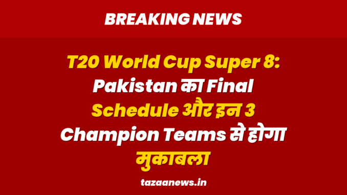 पाकिस्तान क्रिकेट टीम ने T20 World Cup Super Eight में अपनी जगह पक्की कर ली है। अब फैंस के मन में सबसे बड़ा सवाल यह है कि पाकिस्तान की टीम सुपर एट में कब, किससे और कहाँ भिड़ेगी? इस रिपोर्ट में आपको पाकिस्तान का पूरा Match Schedule और सेमीफाइनल में क्वालीफाई करने का गणित बताया जाएगा।